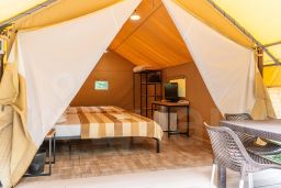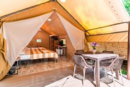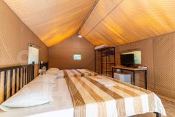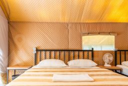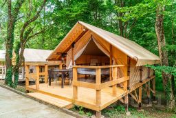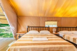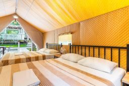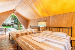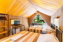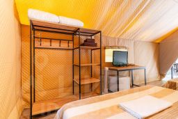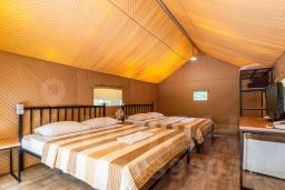 Уютный домик 20 м² с открытой террасой и видом на сосновый лес. Внутри — две большие двуспальные кровати, стол, четыре стула, открытый шкаф, пуфики и вешалки. Есть вентилятор, холодильник, Wi-Fi и внутренний телефон. Включена регулярная уборка.
