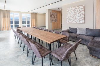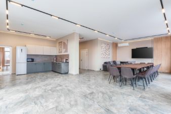 Вместительная кухня-столовая за одним столом комфортно размещается до 20 человек