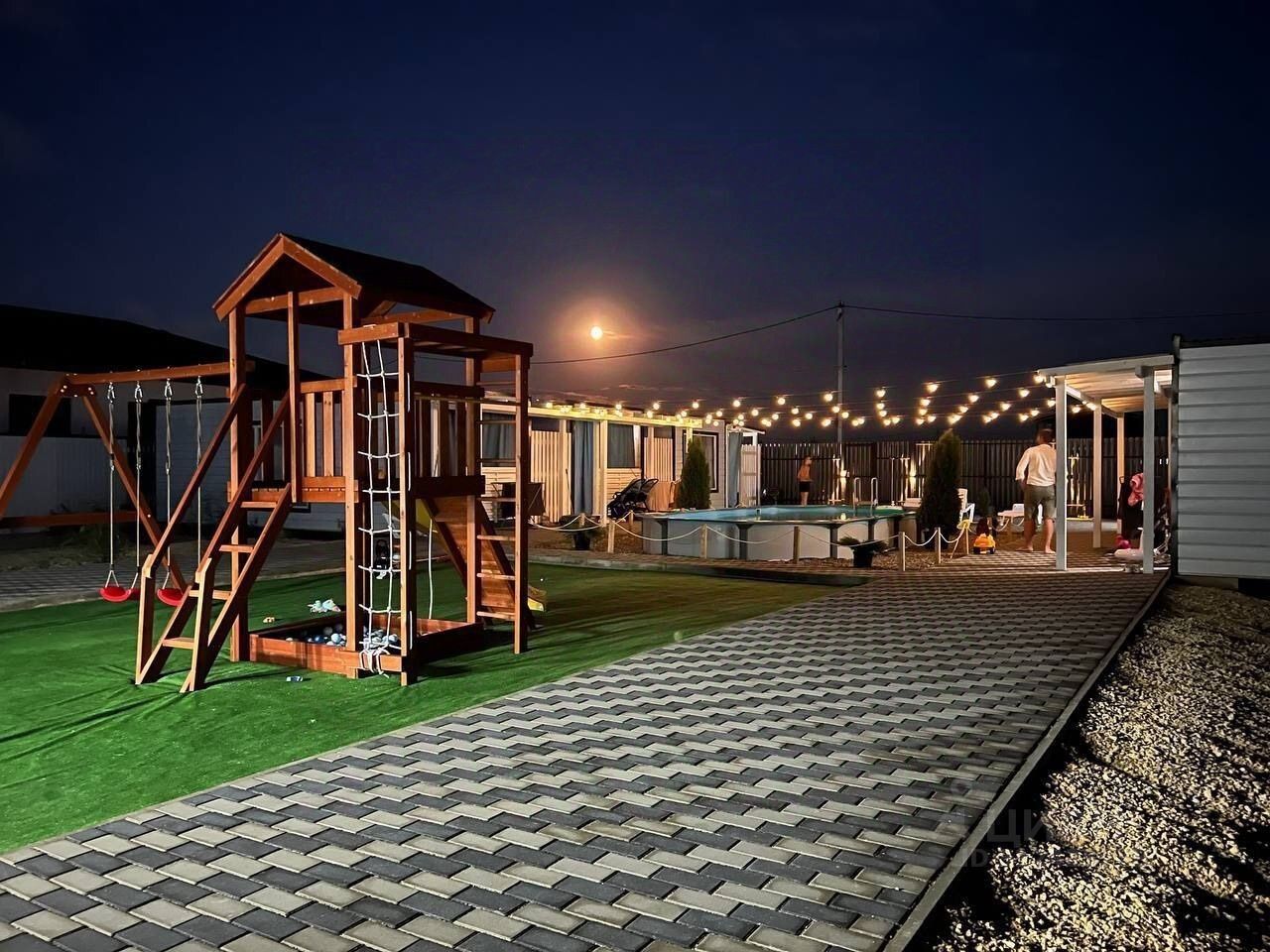 Двор вымощен брусчаткой. На территории: бассейн длинной 7,3 метра, ширина 3,7 метра, глубина 140 см. мангальная зона и детская площадка.