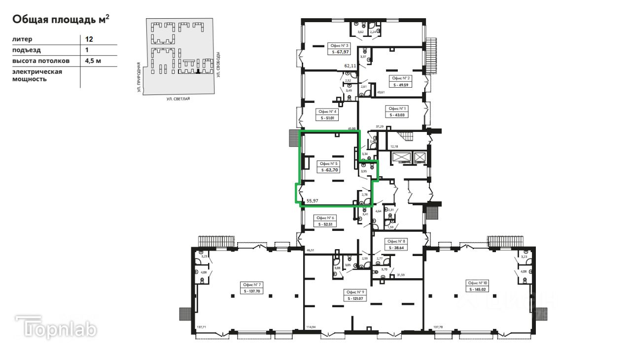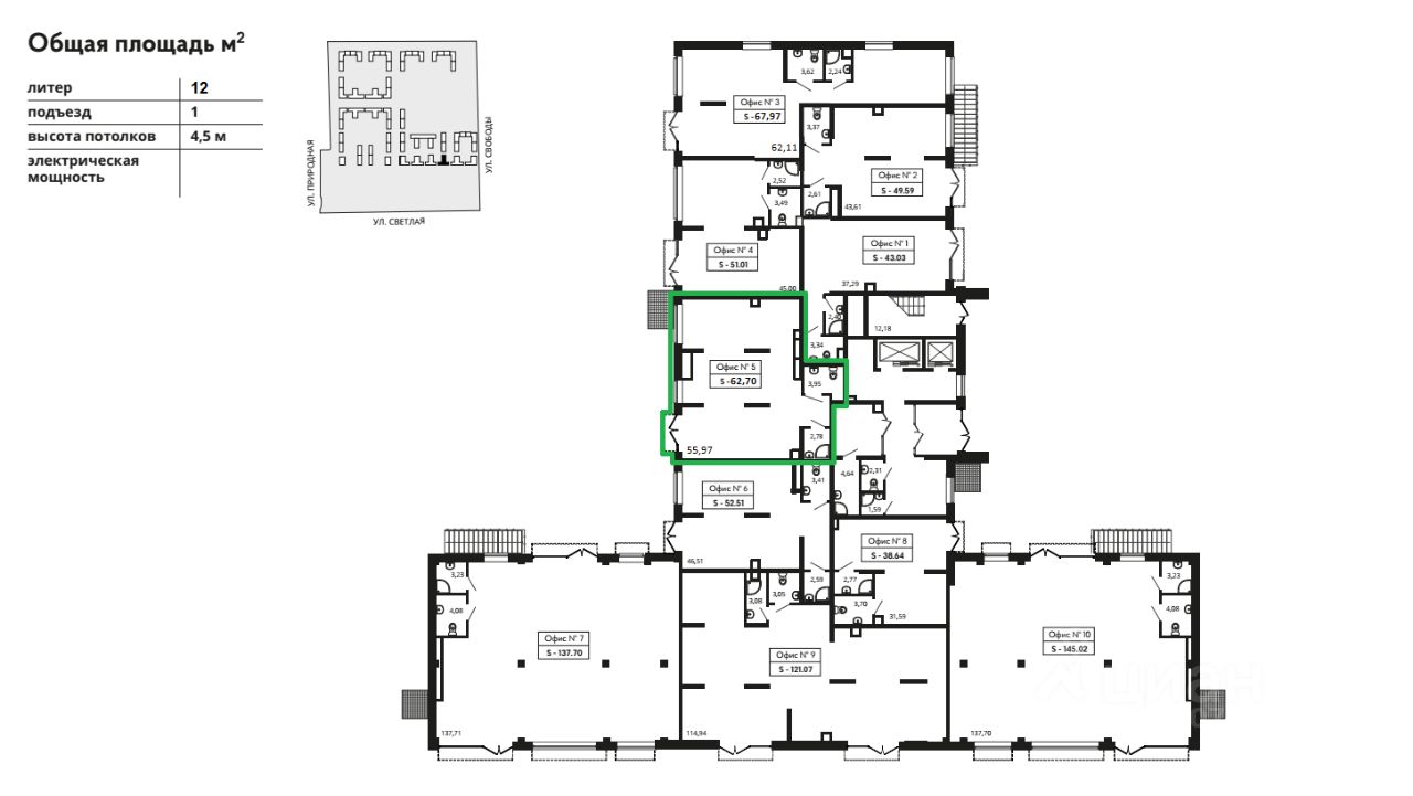 Доступны помещения площадью от 38 до 68 квадратных метров.