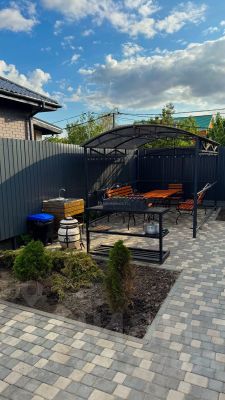 Отдельный двор вымощен тротуарной плиткой и укомплектован мангальной зоной и беседкой.