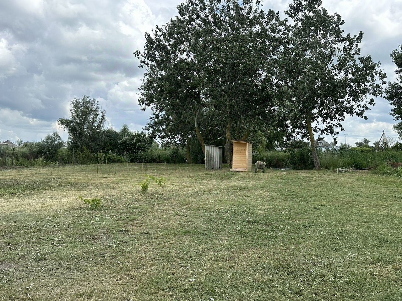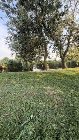 Участок расчищен,осталась только строение (раньше была баня,можно восстановить),берег поднят и вырыта бухта под лодку.
