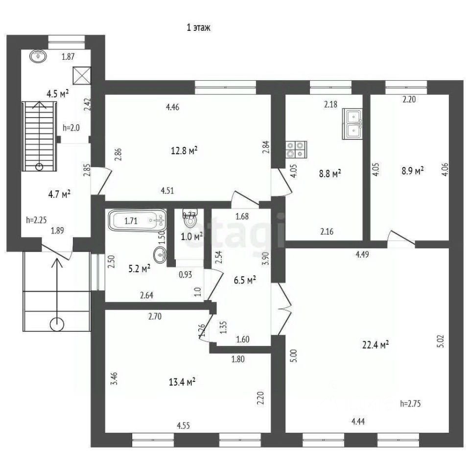 Общая площадь помещений составляет 1158 м2, включая апартаменты и 32 комфортабельных номера разной вместимости, (вместимость 120 чел.) от 2х до 5ти местных.