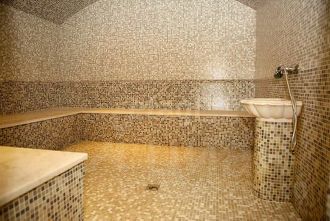 На первом этаже расположены ресепшн, БАССЕЙН С ПОДОГРЕВОМ, БАНЯ, ХАМАМ, душевые, хозяйственные помещения и четыре номера, включая вариант с кухонно-столовой зоной и просторной террасой.