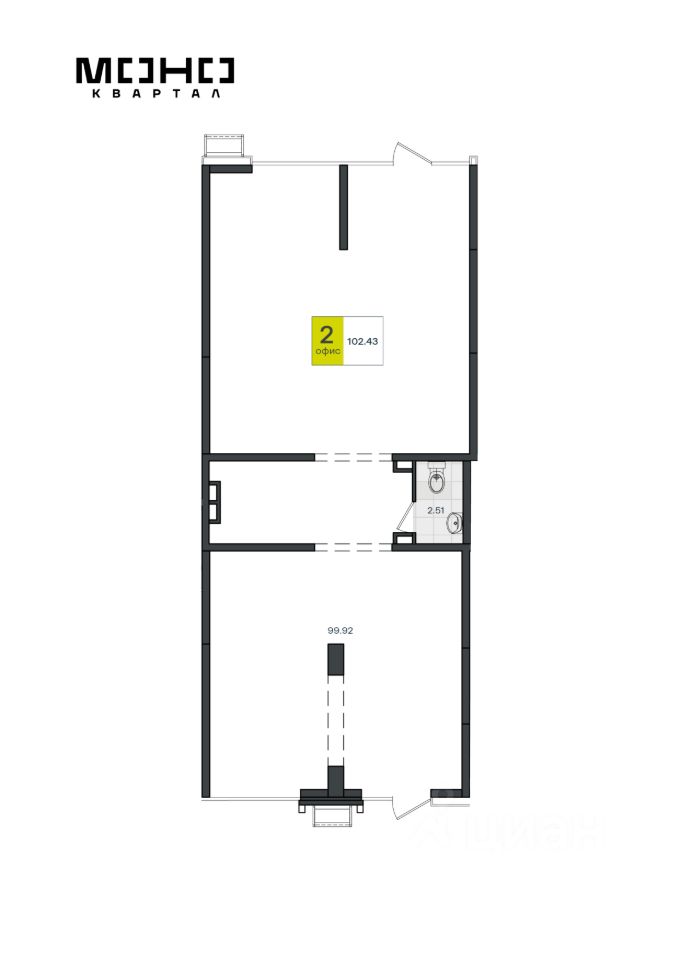 Офисное помещение площадью 102.43 находится на 1-м этаже нового жилого среднеэтажного дома. Помещение в предчистовой отделке, есть возможность сделать ремонт по своему усмотрению, планировка свободная. Идеально для офиса вашей организации или компании. Все коммуникации центральные, высота потолков 3, 64 м.