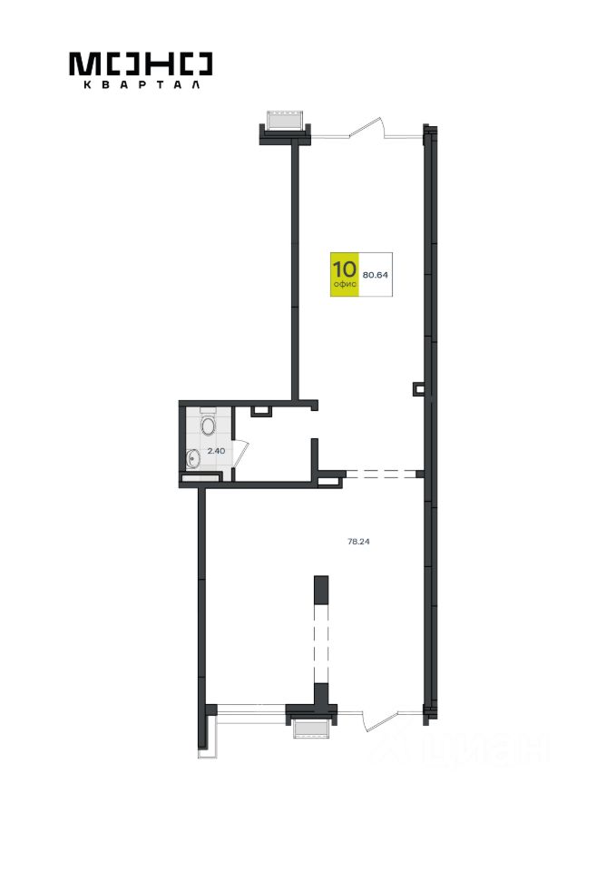 Офисное помещение площадью 80.64 находится на 1-м этаже нового жилого среднеэтажного дома. Помещение в предчистовой отделке, есть возможность сделать ремонт по своему усмотрению, планировка свободная. Идеально для офиса вашей организации или компании. Все коммуникации центральные, высота потолков 3, 64 м.