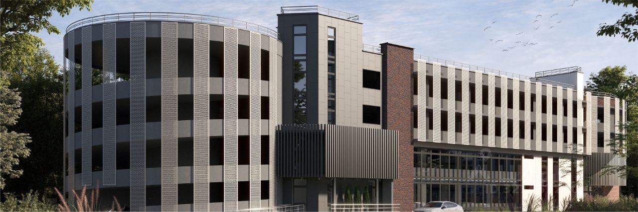 Презентабельный экстерьер фасады из декоративного кирпича, стекла и керамогранита.