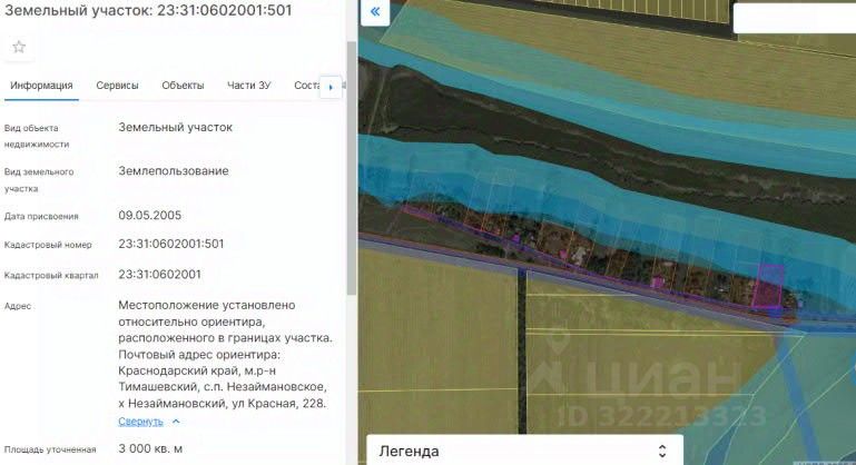 Земельный участок, находящийся в муниципальной собственности Незаймановского сельского поселения, расположенного по адресу Российская Федерация, Краснодарский край, Тимашевский район, Незаймановское сельское поселение, хут. Незаймановский, ул. Красная, 228, площадью 3000 кв. м., кадастровый номер 23:31:0602001:501, категория земель - земли населенных пунктов, разрешенный вид использования - личное подсобное хозяйство.