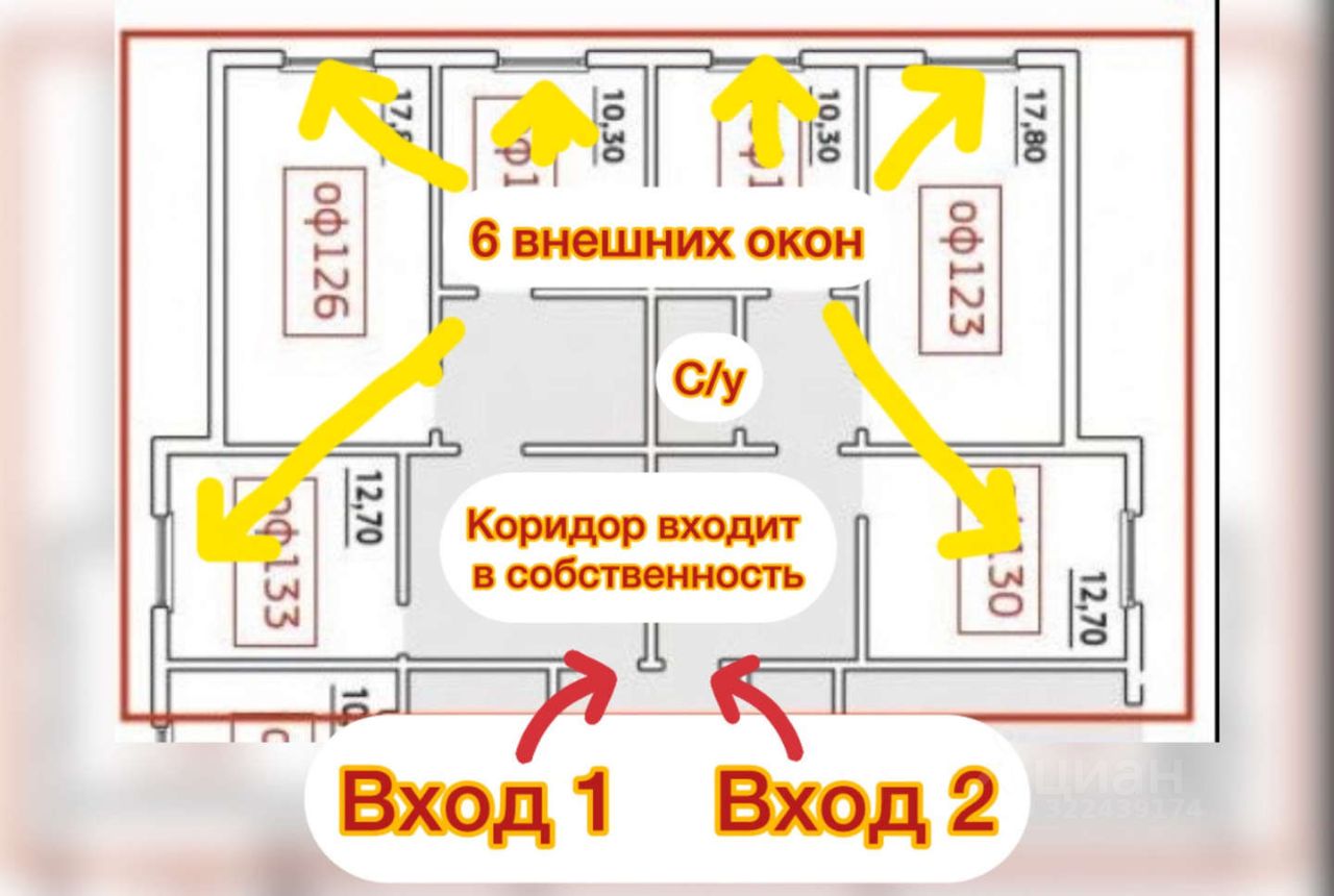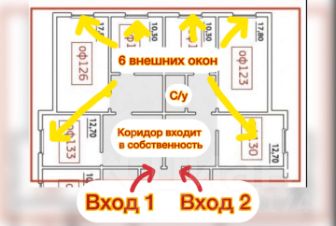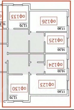 Помещение зарегистрированы кадастром без разбивки на отдельные комнаты, при этом каким-то чудом в собственность вошли коридоры - на схеме выше серая площадь в красном квадрате.