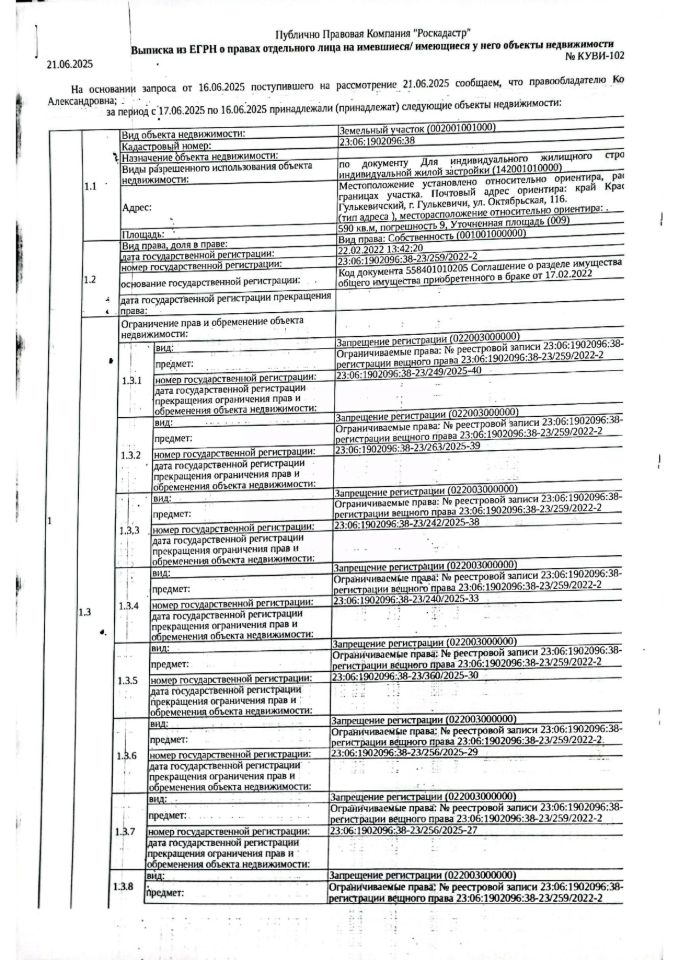 Д-к: Конотопова Ю.А. Здание жилое, площадь 66,8 кв.м., кадастровый номер 23:06:1902096:83, земельный участок (для индивидуального жилищного строительства), площадь 590 кв.м., кадастровый номер 23:06:1902096:38. Адрес: Краснодарский край, Гулькевичский район, г. Гулькевичи, ул. Октябрьская, д. 116. Начальная цена 2 125 000 руб., задаток 2 125 руб., шаг аукциона 21 250 руб., ув. 1070