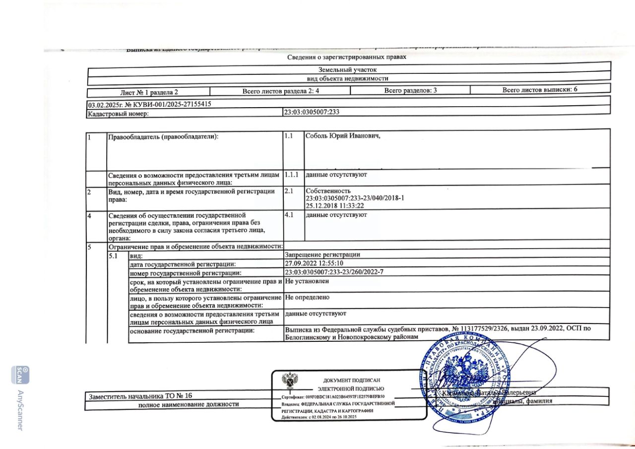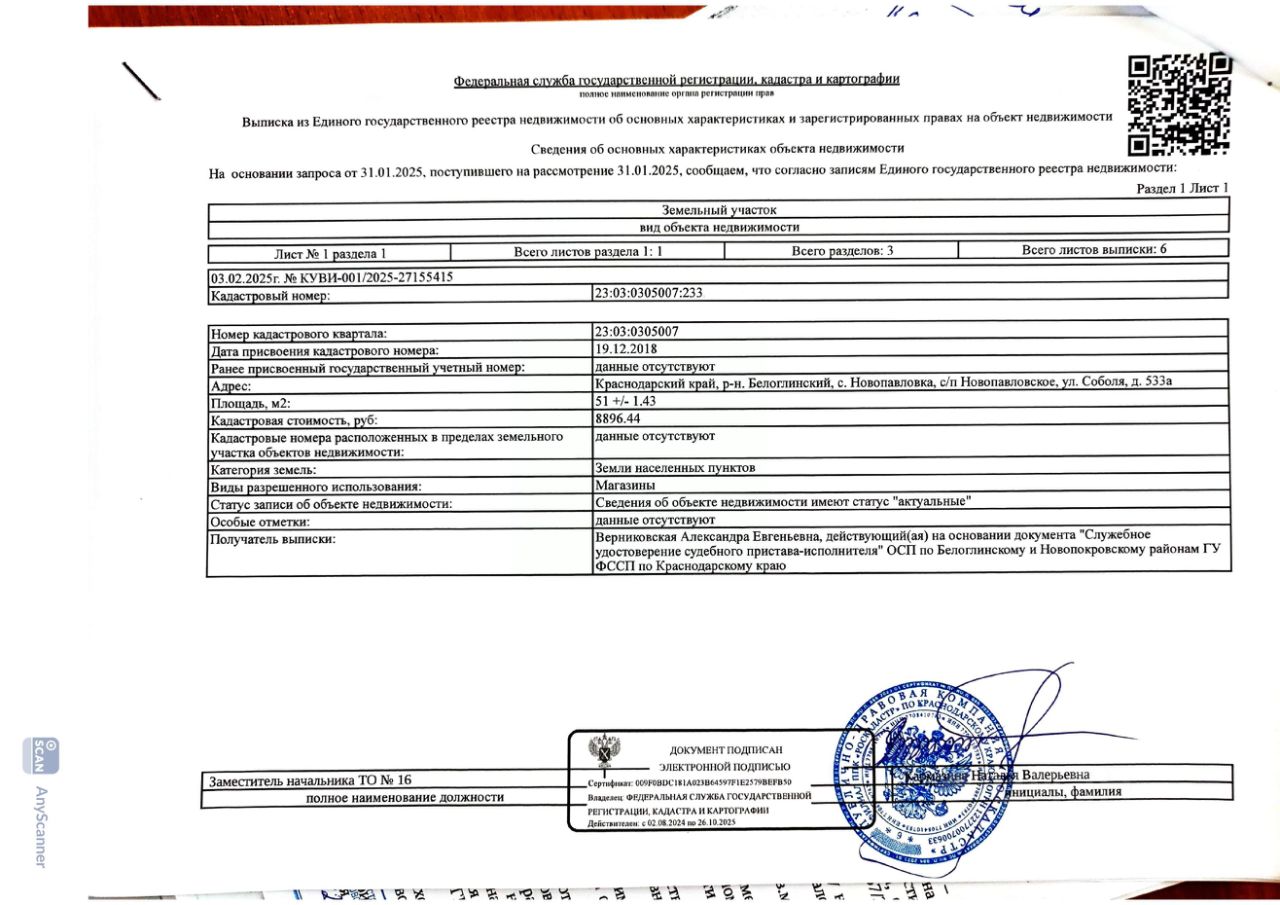 Д-к: Соболь Ю.И. Земельный участок (земли населенных пунктов), площадь 51.00 кв.м., кадастровый номер 23:03:0305007:233. Адрес: Краснодарский край, Белоглинский район, с. Новопавловка, с/п Новопавловское, ул. Соболя, д. 533А. Начальная цена 75 300,65 руб., задаток 11 296 руб., шаг аукциона 754 руб., ув.950