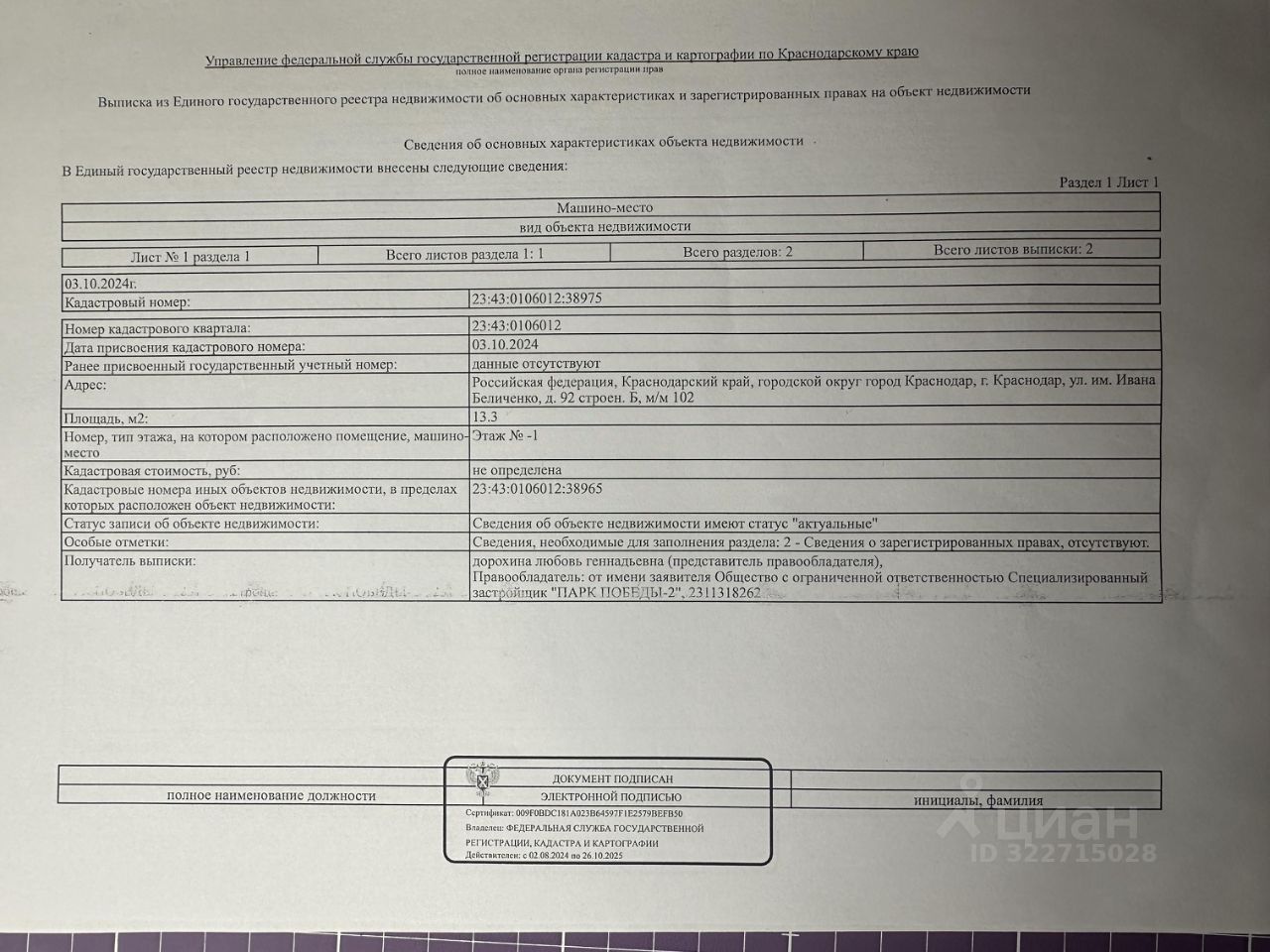 Продается Машино-место на подземной парковке. ул. Ивана Беличенко 92, стр Б Охрана, видеонаблюдение. Обслуживание в месяц 1300₽. Собственник.