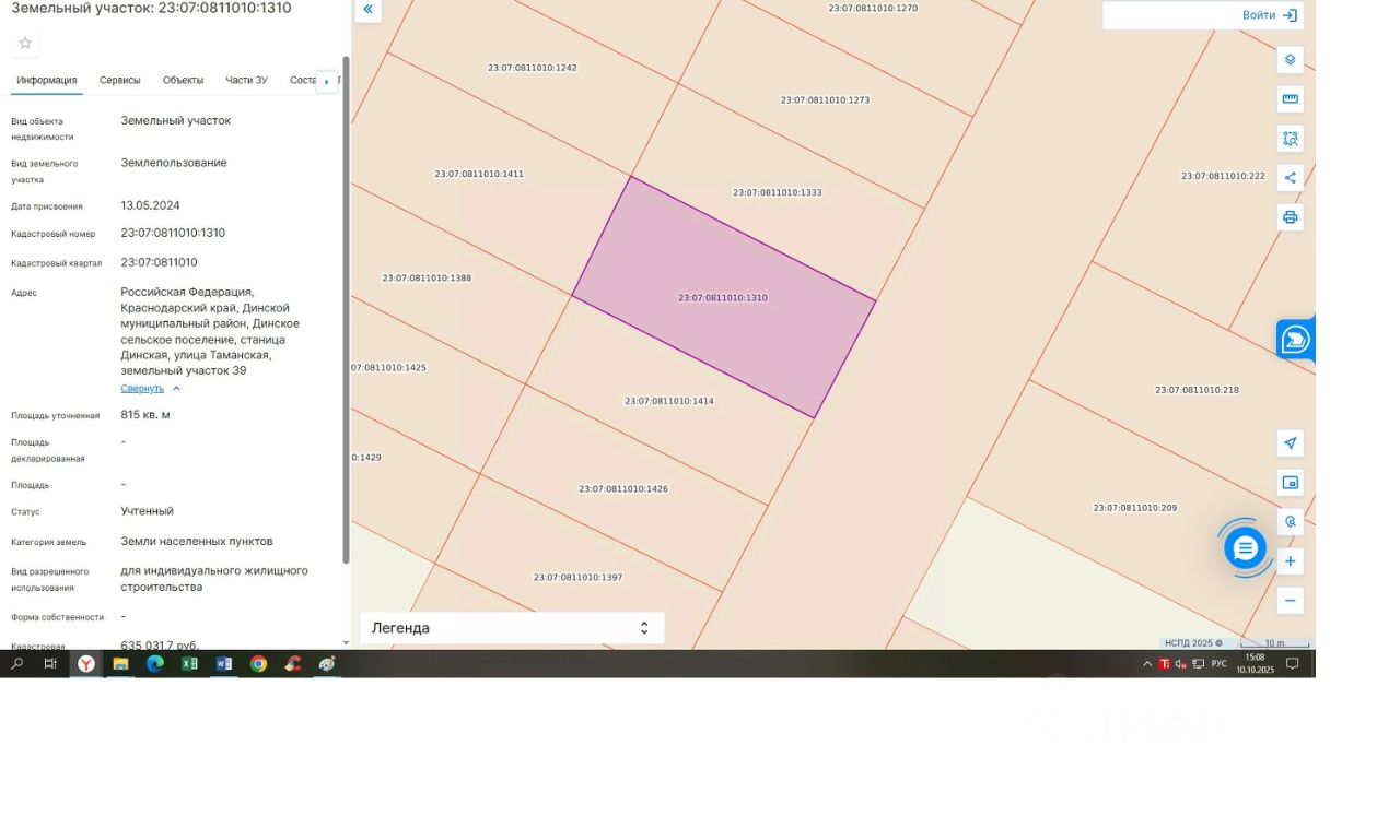 земельный участок, расположенный по адресу: Российская Федерация, Краснодарский край, Динской муниципальный район, Динское сельское поселение, станица Динская, улица Таманская, земельный участок 39, площадью 815 кв. м, с кадастровым номером 23:07:0811010:1310, форма собственности: не разграничена, категория земель: земли населенных пунктов, с видом разрешенного использования: для индивидуального жилищного строительства