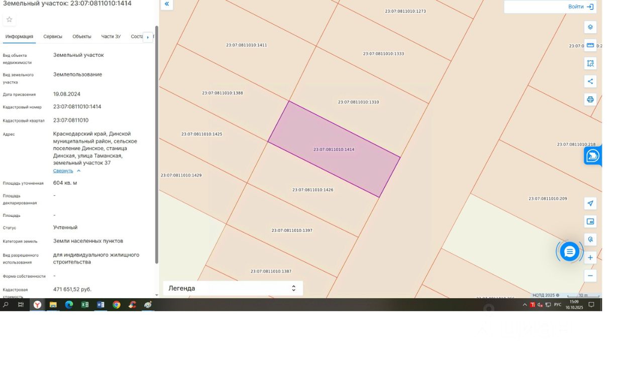 земельный участок, расположенный по адресу: Российская Федерация, Краснодарский край, Динской муниципальный район, Динское сельское поселение, станица Динская, улица Таманская, земельный участок 37, площадью 604 кв. м, с кадастровым номером 23:07:0811010:1414, форма собственности: не разграничена, категория земель: земли населенных пунктов, с видом разрешенного использования: для индивидуального жилищного строительства