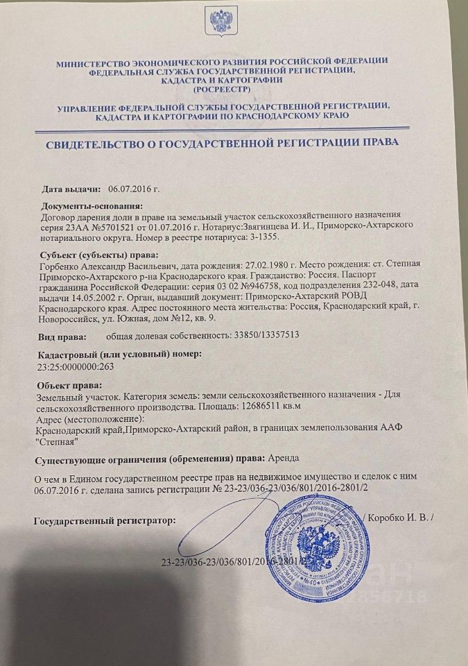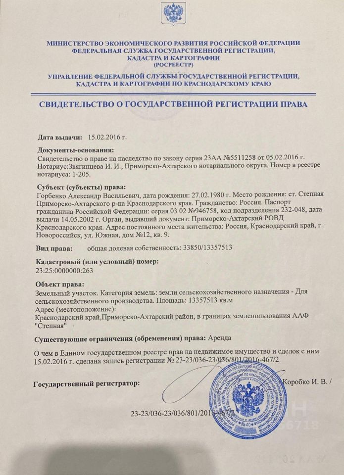 Продается земельный участок ПАЙ . 6,77 га кадастровый номер 23:25:0000000:263 . Земля сельскохозяйственного назначения Для сельскохозяйственного производства. Цена указана за участок . Срок аренды у арендатора заканчивается в августе 2026 года . Звоните или пишите по всем вопросам на все отвечу . Собственник.