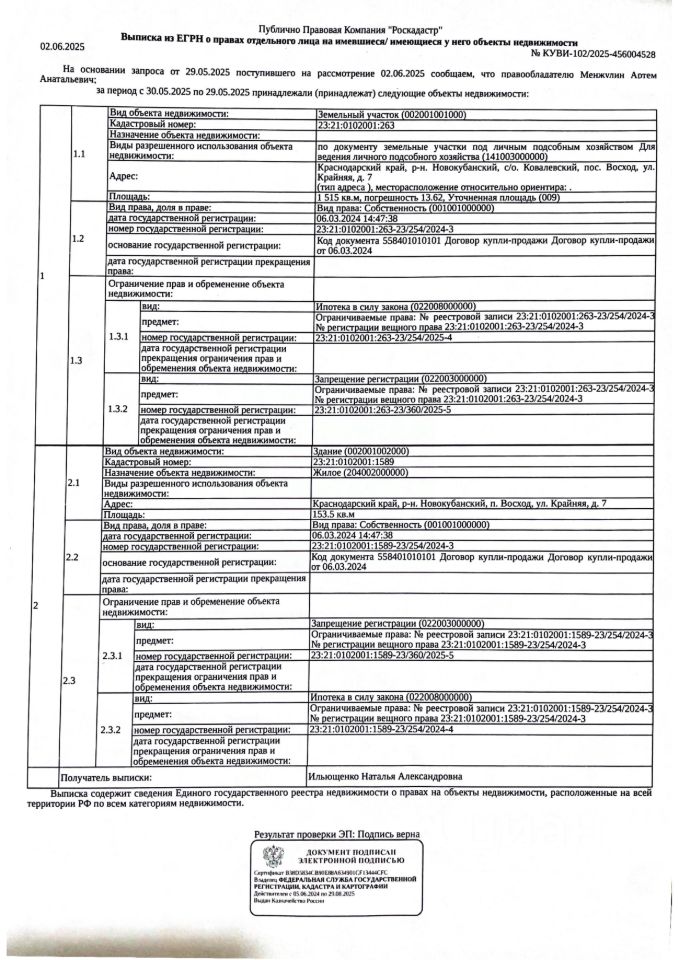 Д-к: Менжулин А.А. Жилой дом, площадь 153,5 кв.м., кадастровый номер 23:21:0102001:1589, земельный участок (под личным подсобным хозяйством), площадь 1515+/-13,62 кв.м., кадастровый номер 23:21:0102001:263. Адрес: Краснодарский край, Новокубанский район, п. Восход, ул. Крайняя, д. 7. Начальная цена 2 111 400 руб., задаток 2 112 руб., шаг аукциона 21 114 руб., ув. 1189