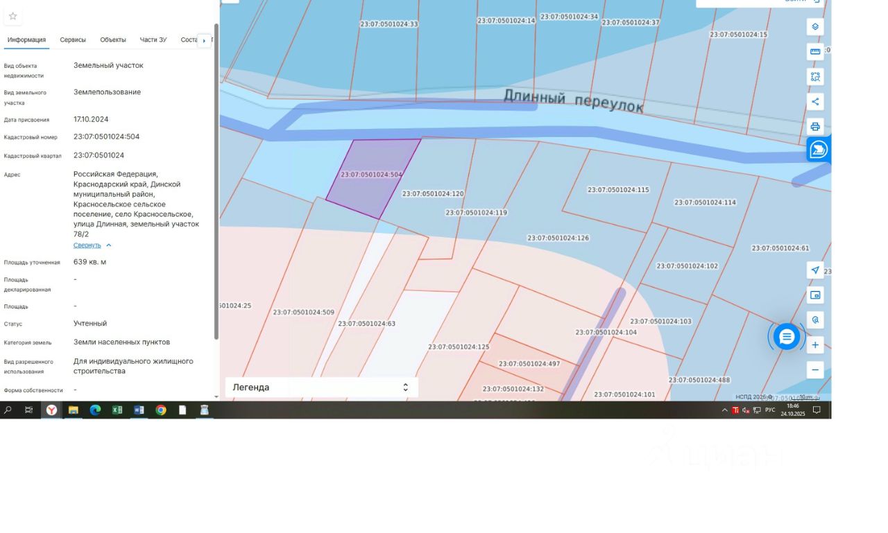 земельный участок, расположенный по адресу: Российская Федерация, Краснодарский край, Динской муниципальный район, Красносельское сельское поселение, село Красносельское, улица Длинная, земельный участок 78/2, площадью 639 кв. м, с кадастровым номером 23:07:0501024:504, форма собственности: не разграничена, категория земель: земли населенных пунктов, с видом разрешенного использования: для индивидуального жилищного строительства