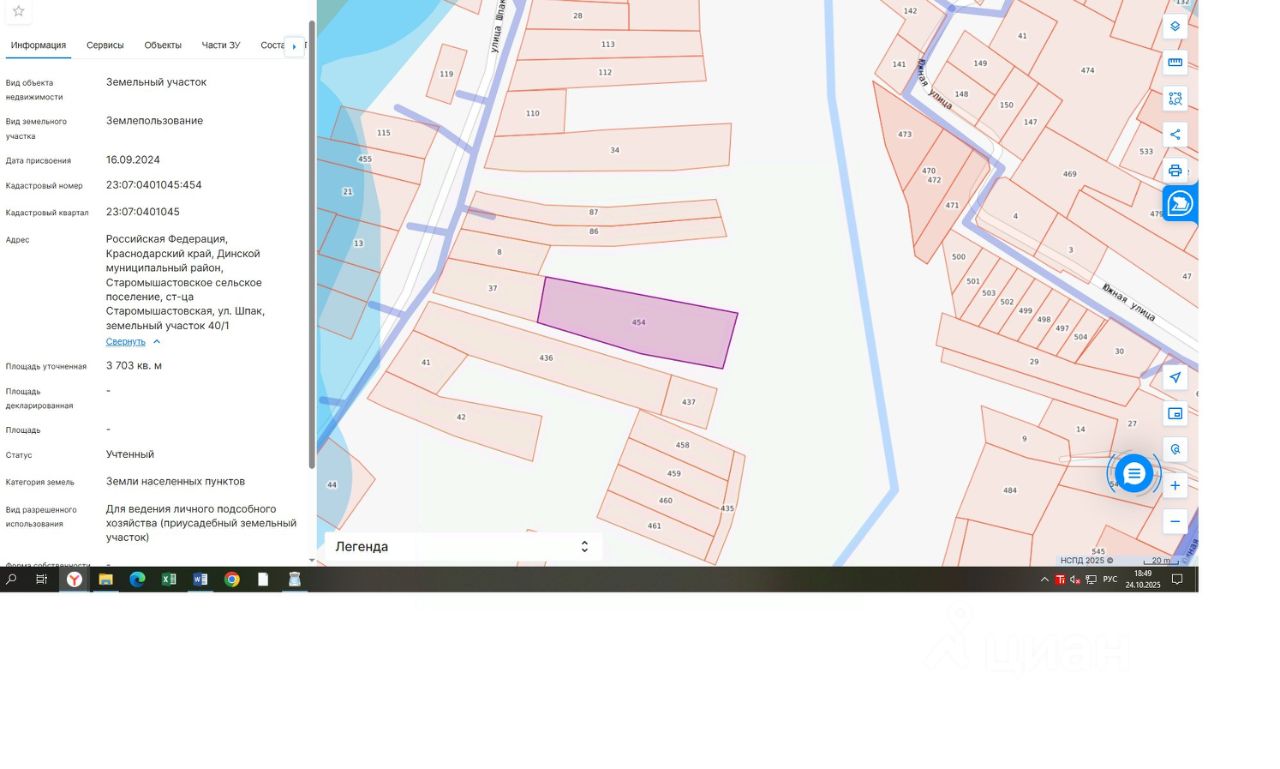 земельный участок, расположенный по адресу: Российская Федерация, Краснодарский край, Динской муниципальный район, Старомышастовское сельское поселение, ст. Старомышастовская, ул. Шпак, земельный участок 40/1, площадью 3703 кв. м, с кадастровым номером 23:07:0401045:454, форма собственности: не разграничена, категория земель: земли населенных пунктов, с видом разрешенного использования: для ведения личного подсобного хозяйства (приусадебный земельный участок)