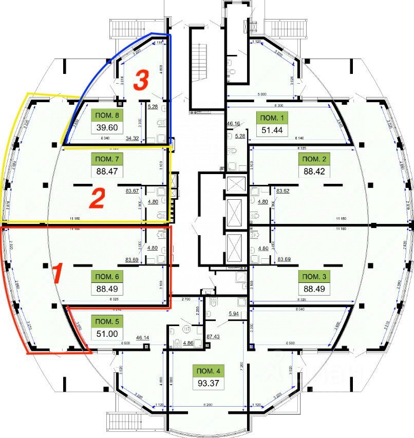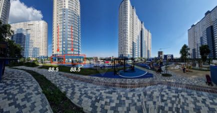 Выходит на центральную в ЖК детскую и спортивную площадку.
