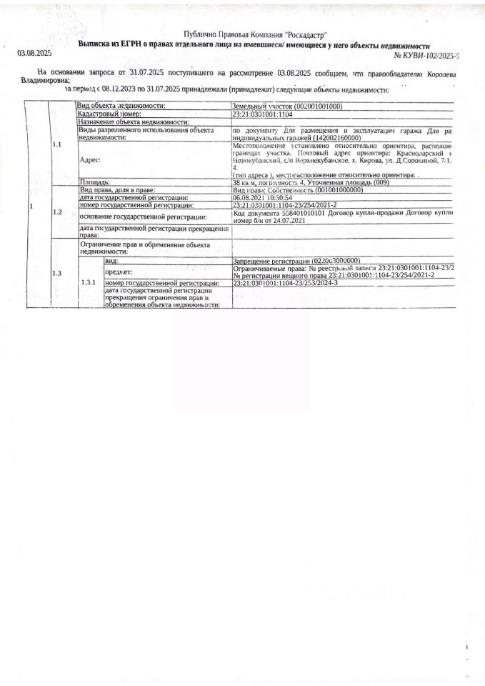 Д-к: Королева Ю.В. Здание нежилое (гараж), площадь 34,1 кв.м., кадастровый номер 23:21:0301001:1222, земельный участок, площадь 38 кв.м., кадастровый номер 23:21:0301001:1104 (для размещения индивидуальных гаражей). Адрес: Краснодарский край, Новокубанский район, с/п Верхнекубанское, х. Кирова, ул. Д. Сорокиной, 7/1, гараж 4. Начальная цена 324 700 руб., задаток 48 705 руб., шаг аукциона 3 247руб., ув. 1191.