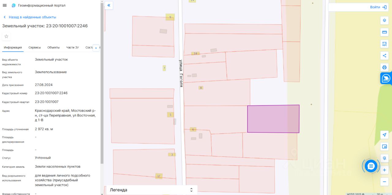 Земельный участок площадью 2972 кв.м, с кадастровым номером 23:20:1001007:2246, местоположение участка: Краснодарский край, Мостовский район, станица Переправная, улица Восточная, 1-В, разрешенное использование: для ведения личного подсобного хозяйства (приусадебный земельный участок), категория земель: земли населенных пунктов.