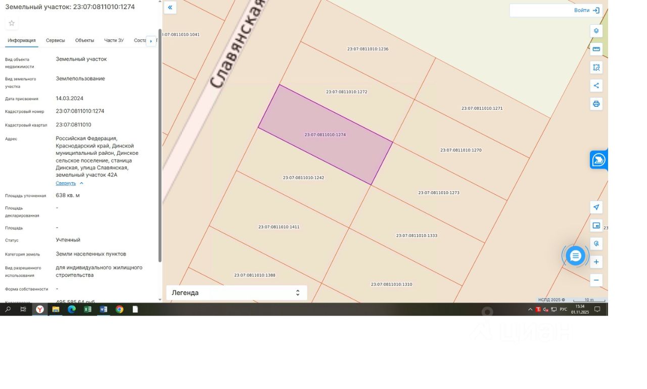 земельный участок, расположенный по адресу: Российская Федерация, Краснодарский край, Динской муниципальный район, Динское сельское поселение, станица Динская, улица Славянская, земельный участок 42А, площадью 638 кв. м, с кадастровым номером 23:07:0811010:1274, форма собственности: не разграничена, категория земель: земли населенных пунктов, с видом разрешенного использования: для индивидуального жилищного строительства