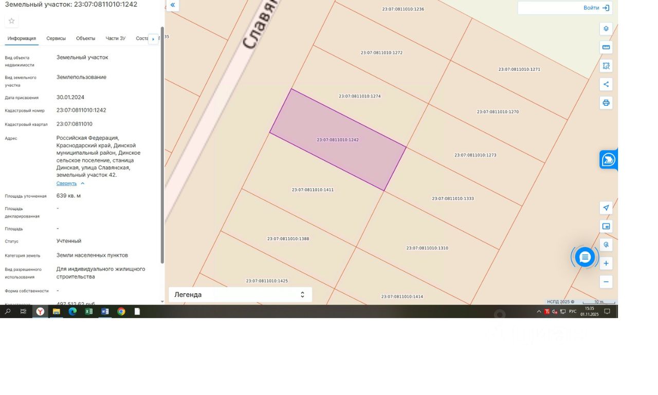 земельный участок, расположенный по адресу: Российская Федерация, Краснодарский край, Динской муниципальный район, Динское сельское поселение, станица Динская, улица Славянская, земельный участок 42, площадью 639 кв. м, с кадастровым номером 23:07:0811010:1242, форма собственности: не разграничена, категория земель: земли населенных пунктов, с видом разрешенного использования: для индивидуального жилищного строительства
