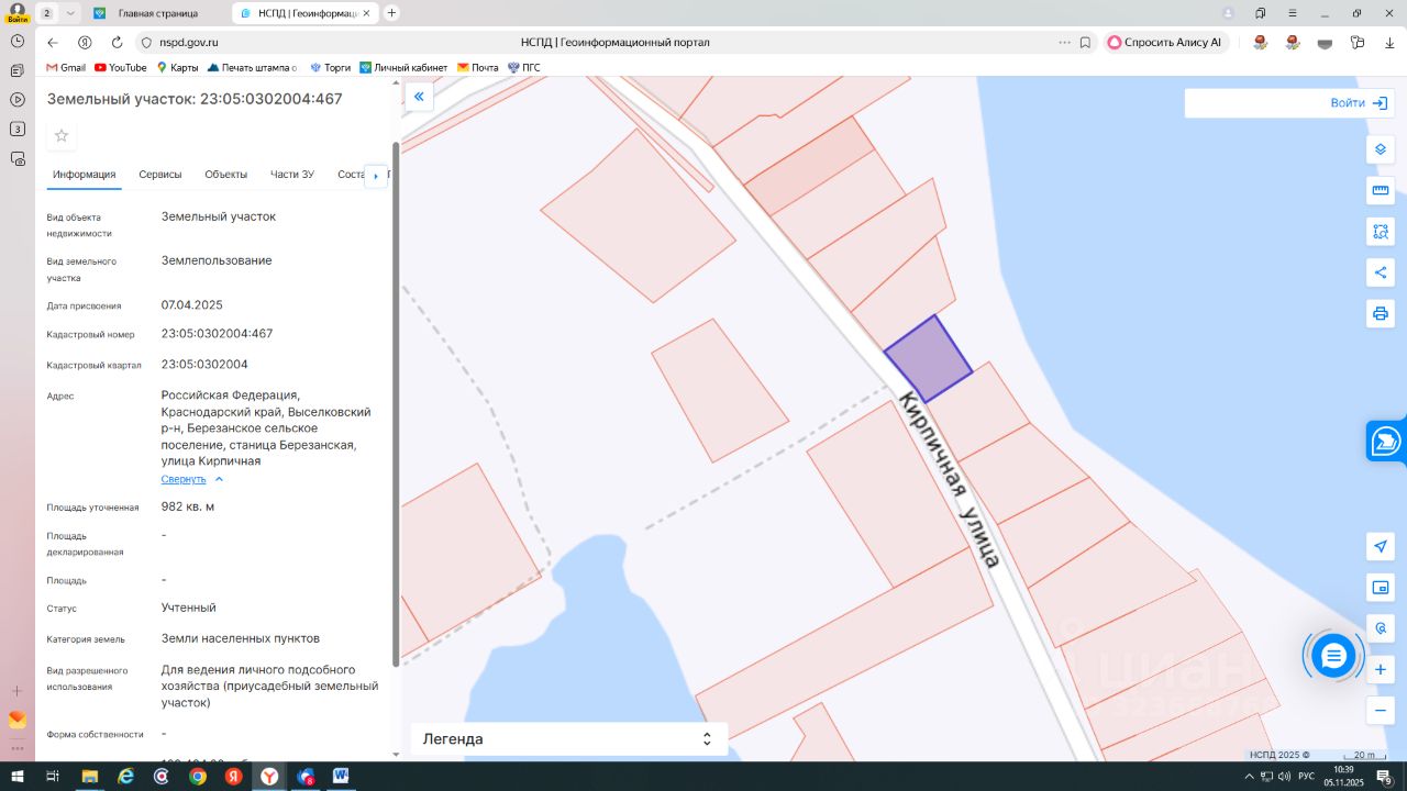земельный участок , с кадастровым номером 23:05:0302004:467, находящийся в государственной собственности, категория земель - земли населенных пунктов, площадью 982 кв. м, расположенный по адресу: Российская Федерация, Краснодарский край, Выселковский район, Березанское сельское поселение, ст. Березанская, ул. Кирпичная, вид разрешенного использования: для ведения личного подсобного хозяйства (приусадебный земельный участок).