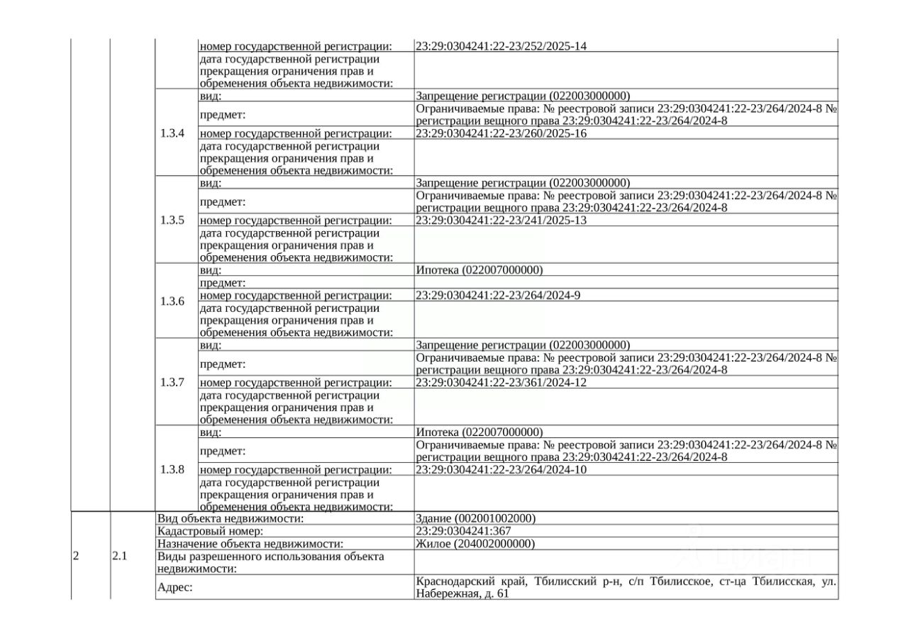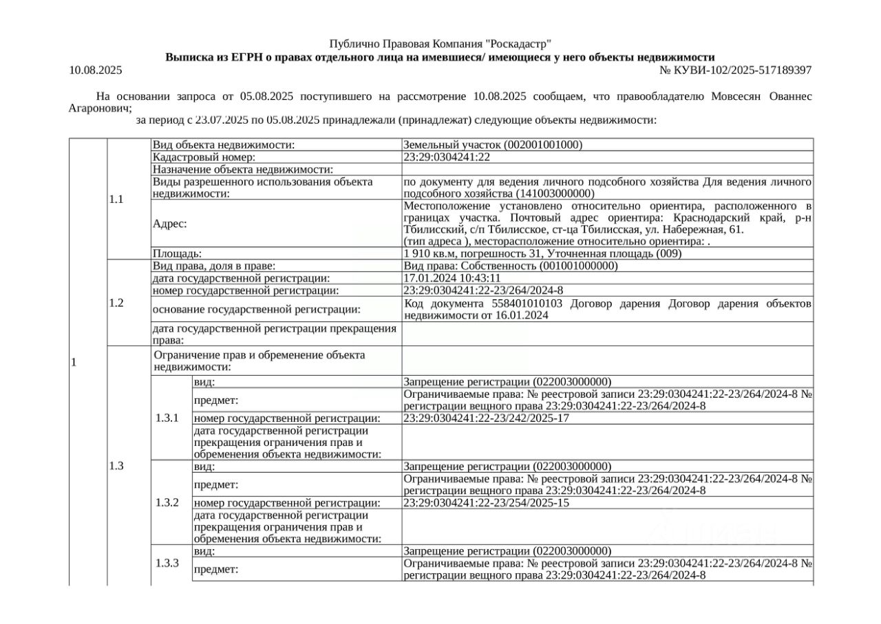 Д-к: Мовсесян О.А. Земельный участок (для ведения личного подсобного хозяйства), площадь 1910 кв.м., кадастровый номер 23:29:0304241:22. Здание жилое, площадь 63,3 кв.м., кадастровый номер 23:29:0304241:367. Адрес: Краснодарский край, Тбилисский район, ст. Тбилисская, ул. Набережная, д. 61. Начальная цена 6 352 000 руб., задаток 6 352 руб., шаг аукциона 63 520 руб., ув. 1467