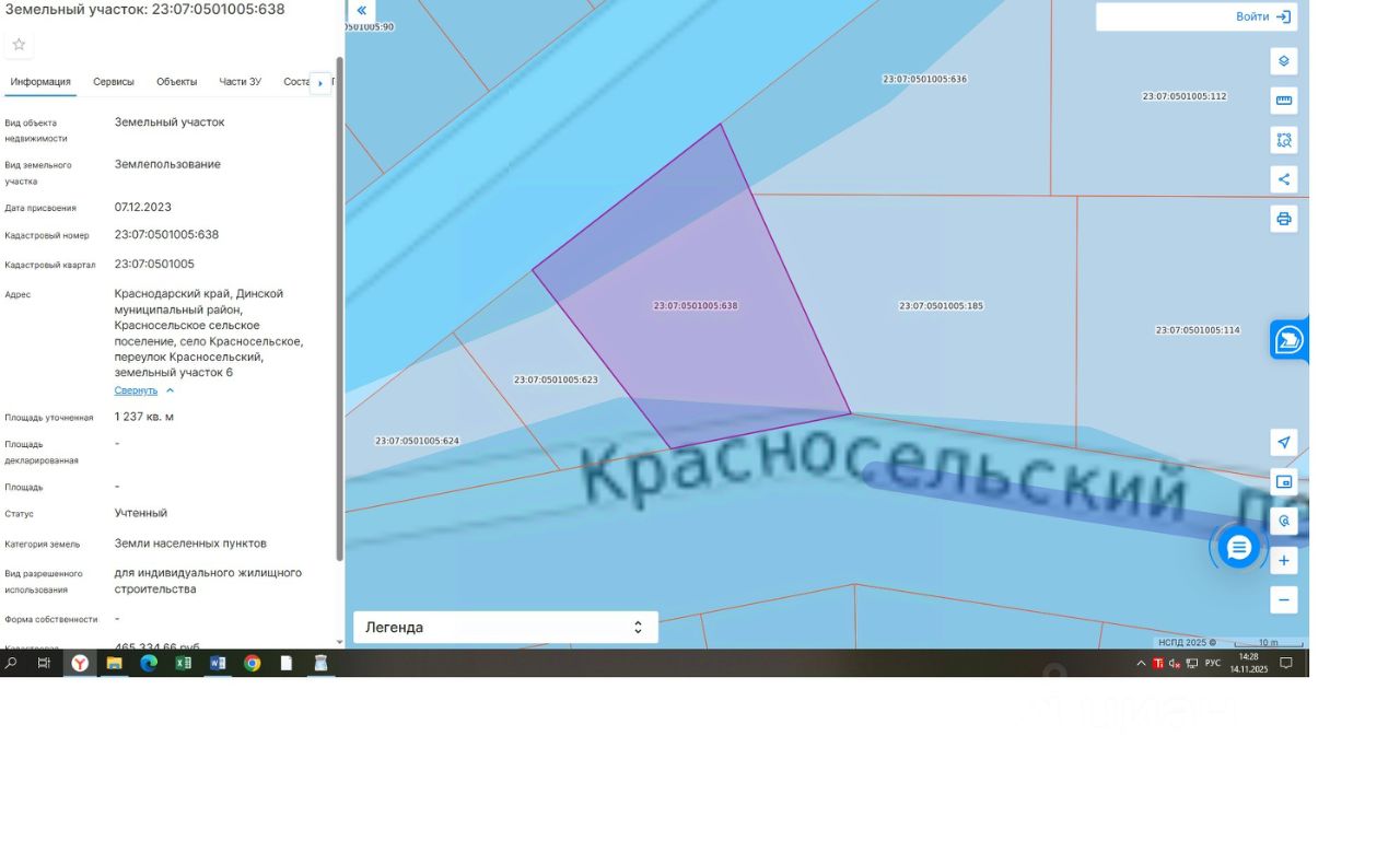 земельный участок, расположенный по адресу: Краснодарский край, Динской муниципальный район, Красносельское сельское поселение, село Красносельское, переулок Красносельский, земельный участок 6, площадью 1237 кв. м, с кадастровым номером 23:07:0501005:638, форма собственности: не разграничена, категория земель: земли населенных пунктов, с видом разрешенного использования: для индивидуального жилищного строительства