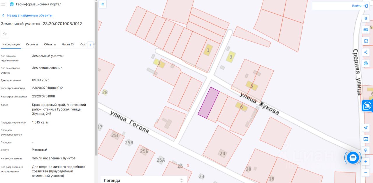 Земельный участок площадью 1015 кв.м, с кадастровым номером 23:20:0701008:1012, местоположение участка: Краснодарский край, Мостовский район, станица Губская, улица Жукова, 2-В, разрешенное использование: для ведения личного подсобного хозяйства (приусадебный земельный участок), категория земель: земли населенных пунктов.