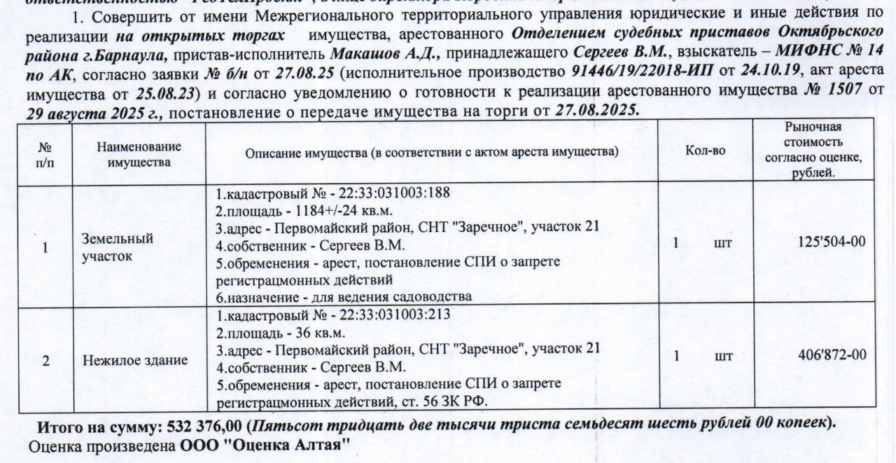 Лот2 Нежилое здание, 1997 г.п., кадастровый 22:33:031003:213, площадь 36 кв.м., количество этажей 1, и земельный участок, назначение земли сельскохозяйственного назначения для ведения садоводства, кадастровый 22:33:031003:188, площадь 1184+/-24 кв.м., адрес: Алтайский край, Первомайский район, СНТ "Заречное", участок 21. Начальная цена 452 519 руб. 60 коп. (Сергеев В.М., запреты на совершение регистрационных действий, арест, ограничения прав на зем. участок, предусмотренные ст. 56 ЗК РФ) (1507) (повторные).