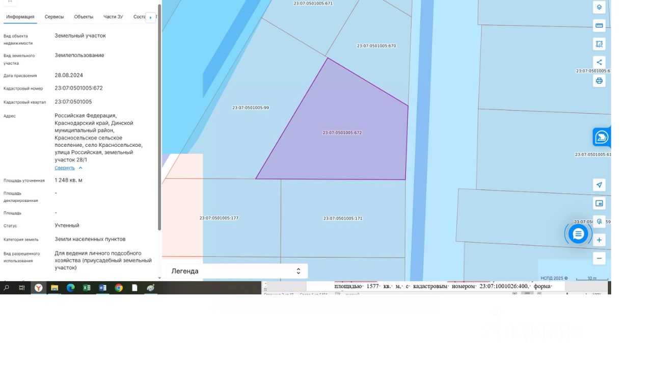 земельный участок, расположенный по адресу: Российская Федерация, Краснодарский край, Динской муниципальный район, Красносельское сельское поселение, село Красносельское, улица Российская, земельный участок 28/1, площадью 1248 кв. м, с кадастровым номером 23:07:0501005:672, форма собственности: не разграничена, категория земель: земли населенных пунктов, с видом разрешенного использования: для ведения личного подсобного хозяйства (приусадебный земельный участок)