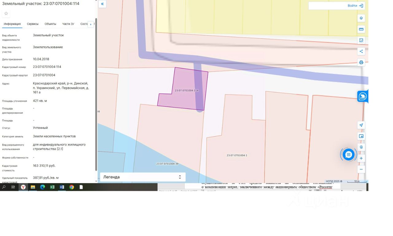 земельный участок, расположенный по адресу: Краснодарский край, Динской район, п. Украинский, ул. Первомайская, д. 161 а, площадью 421 кв. м, с кадастровым номером 23:07:0701004:114, форма собственности: не разграничена, категория земель: земли населенных пунктов, с видом разрешенного использования: для индивидуального жилищного строительства [2.1]