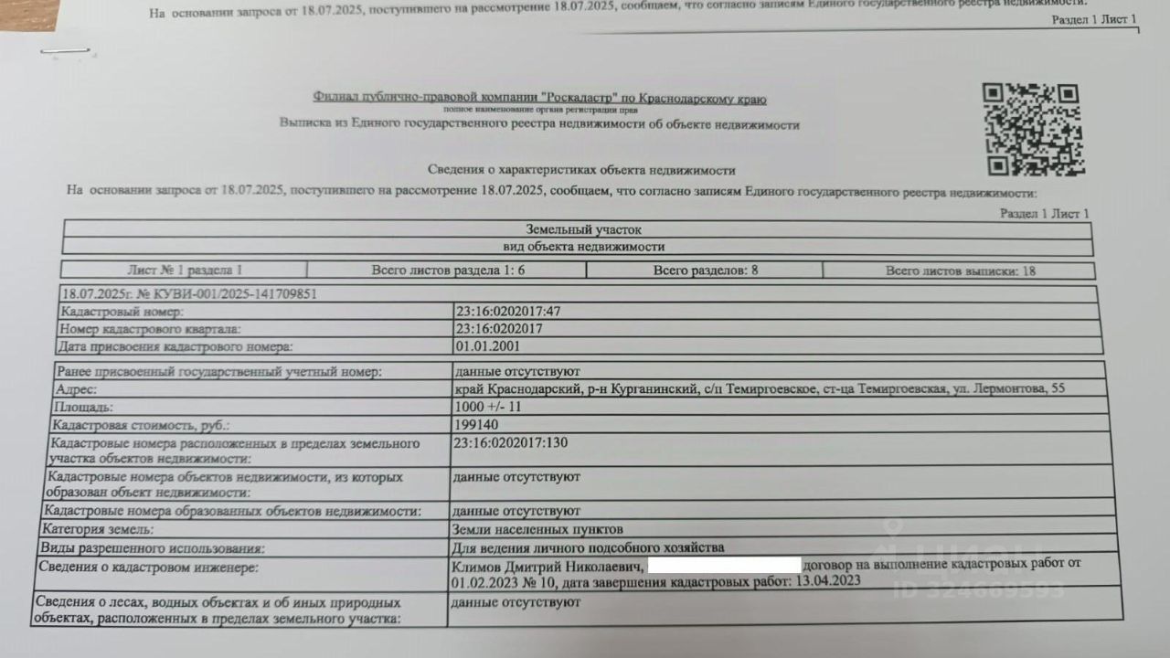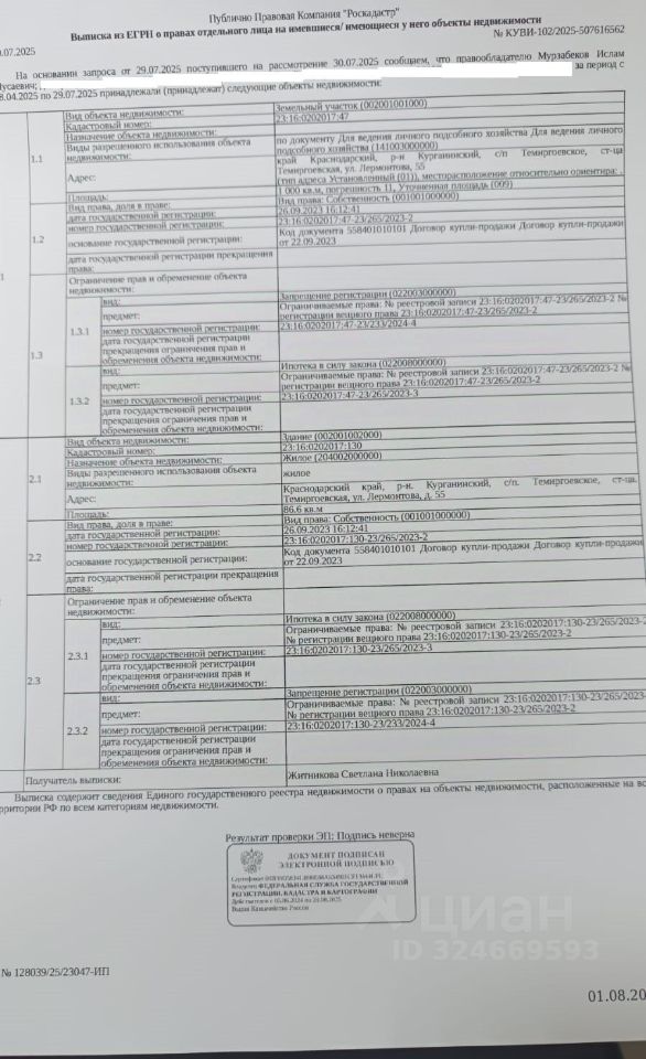 Д-к: Мурзабеков И.М. Земельный участок (для ведения личного подсобного хозяйства), площадь 1000 кв.м., кадастровый номер 23:16:0202017:47, жилой дом, площадь 86,6 кв.м., кадастровый номер 23:16:0202017:130. Адрес: Краснодарский край, Курганинский район, ст. Темиргоевская, ул. Лермонтова, д. 55. Начальная цена 1 408 280 руб., задаток 1 409 руб., шаг аукциона 14 083 руб., ув. 1288