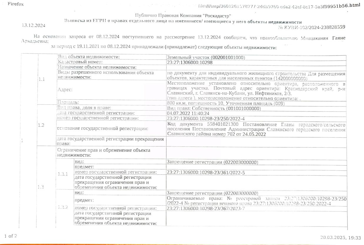 Д-к: Мнацаканян Г.А. Земельный участок (для индивидуального жилищного строительства), площадь 800 кв.м., кадастровый номер 23:27:1306000:10298. Адрес: Краснодарский край, г. Славянск-на-Кубани, ул. Нефтяников, 2/3. Начальная цена 2 936 467 руб., задаток 440 471 руб., шаг аукциона 29 365 руб., ув. 1655