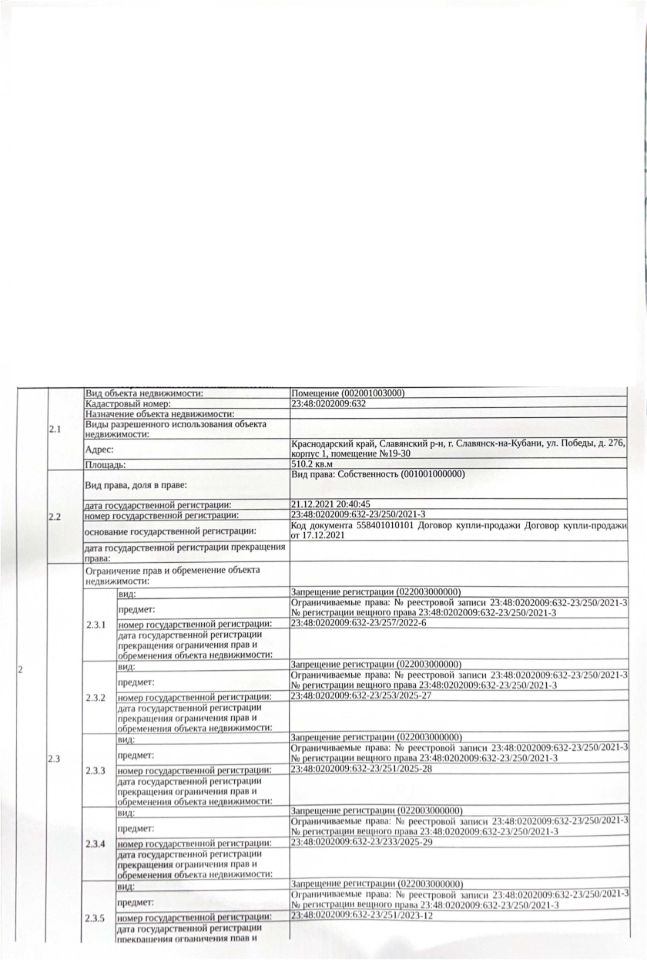 Д-к: Москаленко В.В. Нежилое помещение, площадью 510,2 кв.м., кадастровый номер 23:48:0202009:632. Адрес: Краснодарский край, Славянский район, г.Славянск-на-Кубани, ул.Победы, д.276, корпус 1, помещение 19-30. Начальная цена 19 656 517,75 руб., задаток 2 948 478 руб., шаг аукциона 196 566 руб., ув. 1319