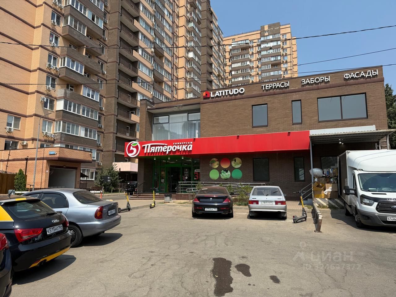 Активный пешеходный и автомобильный трафик; парковка по фасаду.
