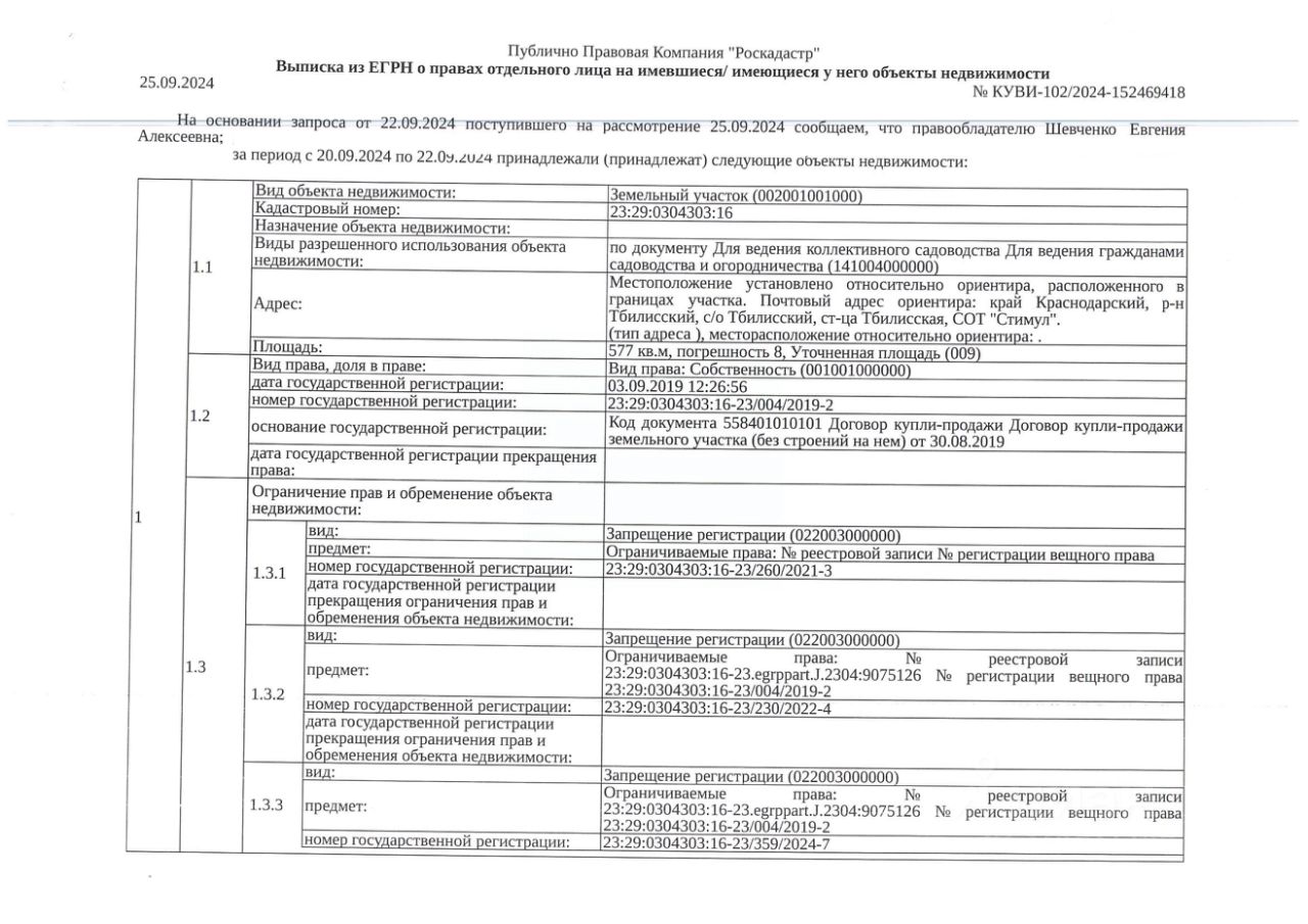 Д-к: Шевченко Е.А. Земельный участок (для ведения садоводства и огородничества), площадь 577 кв.м., кадастровый номер 23:29:0304303:16. Адрес: Краснодарский край, Тбилисский район, ст. Тбилисская, СОТ "Стимул". Начальная цена 278 715 руб., задаток 41 808 руб., шаг аукциона 2 788 руб., ув. 1396