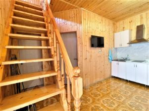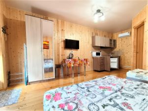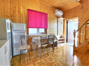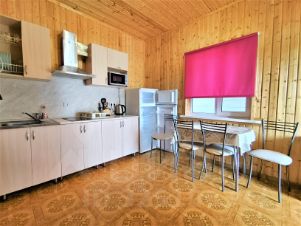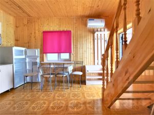 Три уютных двухэтажных благоустроенных дома с мебелью и техникой. В каждом кухня, 3 спальни, 2 санузла. И одноэтажное здание на три полноценных номера со всеми удобствами, кухней и собственным санузлом. В домах установлены бойлеры на 80 л, в номерах на 50 л. Установлена сплит система. Вайфай интернет Ростелеком.