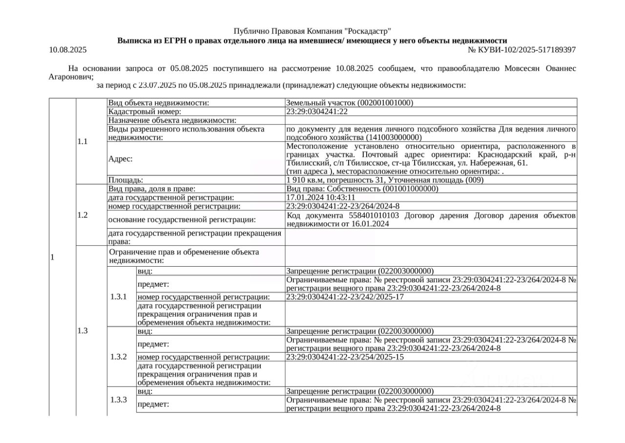 Д-к: Мовсесян О.А. Земельный участок (для ведения личного подсобного хозяйства), площадь 1910 кв.м., кадастровый номер 23:29:0304241:22. Здание жилое, площадь 63,3 кв.м., кадастровый номер 23:29:0304241:367. Адрес: Краснодарский край, Тбилисский район, ст. Тбилисская, ул. Набережная, д. 61. Начальная цена 5 399 200 руб., задаток 5 400 руб., шаг аукциона 53 992 руб., ув. 1467