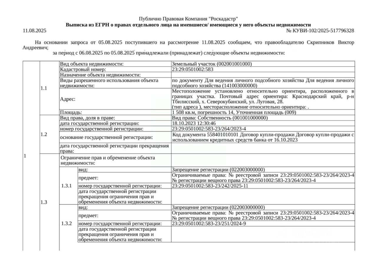 Д-к: Скрипников В.А. Земельный участок (для ведения личного подсобного хозяйства), площадь 1508 кв.м., кадастровый номер 23:29:0501002:583. Адрес: Краснодарский край, Тбилисский район, х. Северокубанский, ул. Луговая, 28. Начальная цена 424 575 руб., задаток 425 руб., шаг аукциона 4 246 руб., ув. 1468