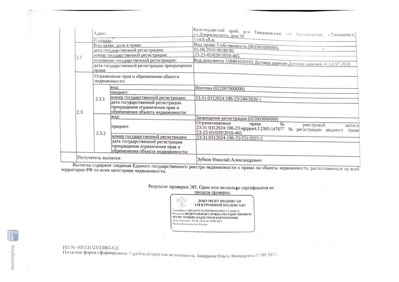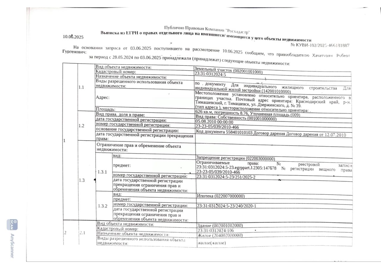 Д-к: Хачатурян Р.Г. Жилой дом, площадь 154,8 кв.м., кадастровый номер 23:31:0312024:106. Земельный участок (для индивидуального жилищного строительства), площадь 626 +/ 8,76 кв.м., кадастровый номер 23:31:0312024:5. Адрес: Краснодарский край, г.Тимашевск, ул. Дзержинского, д. 39. Начальная цена 7 329 040 руб., задаток 7 330 руб., шаг аукциона 73 291 руб., ув. 1541