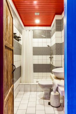душ с туалетными комнатами (11 м кв), две деревянные террасы с летней мебелью, сад