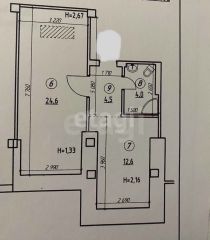 Однокомнатная квартира 55,8 м2, с кухней - 12,6 м2, санузел совмещённый, на 7 мансардном этаже, в кирпичном доме.