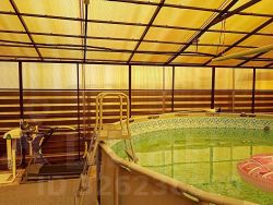 Коммуникации: вода -скважина, канализация- септик, свет 15квт. Всего 9 номеров, в каждом стоят кровати и бытовая техника. На территории имеется крытый бассейн 40 кв. м., что позволяет пользоваться им даже в плохую погоду, когда нет возможности сходить на море, тераса застекленная 32 кв м , конференс-зал 37 кв. м., гараж 24 кв. м., мангальная зона, детская площадка. 20 кв. м. Сама территория уложена плиткой. Так же всё оборудовано действующим видеонаблюдением, что позволяет контролировать ситуацию в гостинице, если вы отсутствуете.