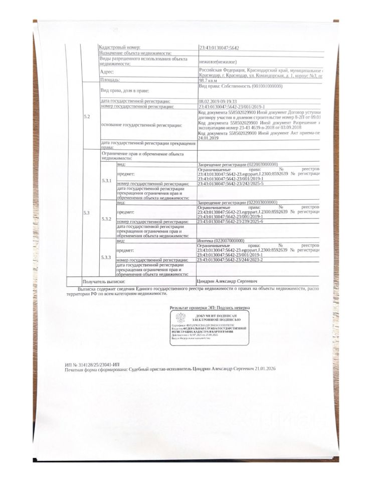 Д-к: Ярисова И.Л. Нежилое помещение, площадь 98,7 кв.м., кадастровый номер 23:43:0130047:5642. Адрес: Краснодарский край, г. Краснодар, ул. Командорская, д. 1, корп. 3, пом. 39-43. Начальная цена 10 000 000 руб., задаток 10 000 руб., шаг аукциона 100 000 руб., ув. 1873