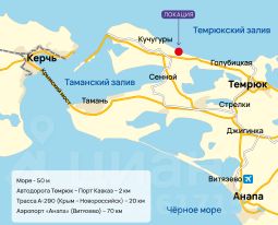 Участок расположен на первой береговой линии в посёлке Кучугуры (курорт местного значения, Темрюкский район). Территория обладает панорамными видами на море, протяжённым выходом к песчаной береговой линии с возможностью организации частного пляжа. Природные преимущества: чистое море с пологим песчаным входом, экология Таманского полуострова, близость к термальным источникам, максимальное количество солнечных дней и самый длинный купальный сезон в России. Отличная транспортная доступность: около 20 км от федеральной трассы А-290 Крым.