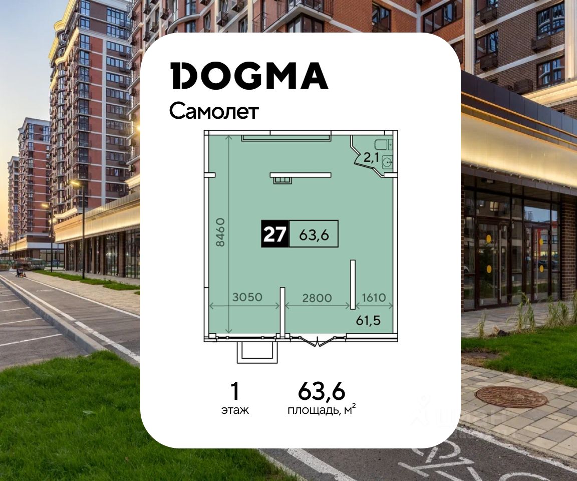 В реализации — коммерческие помещения свободного назначения в литере 27 общей площадью 63.60 кв.м. на 1 этаже в микрорайоне "Самолёт" от застройщика DOGMA, одного из ведущих девелоперов Краснодарского края.