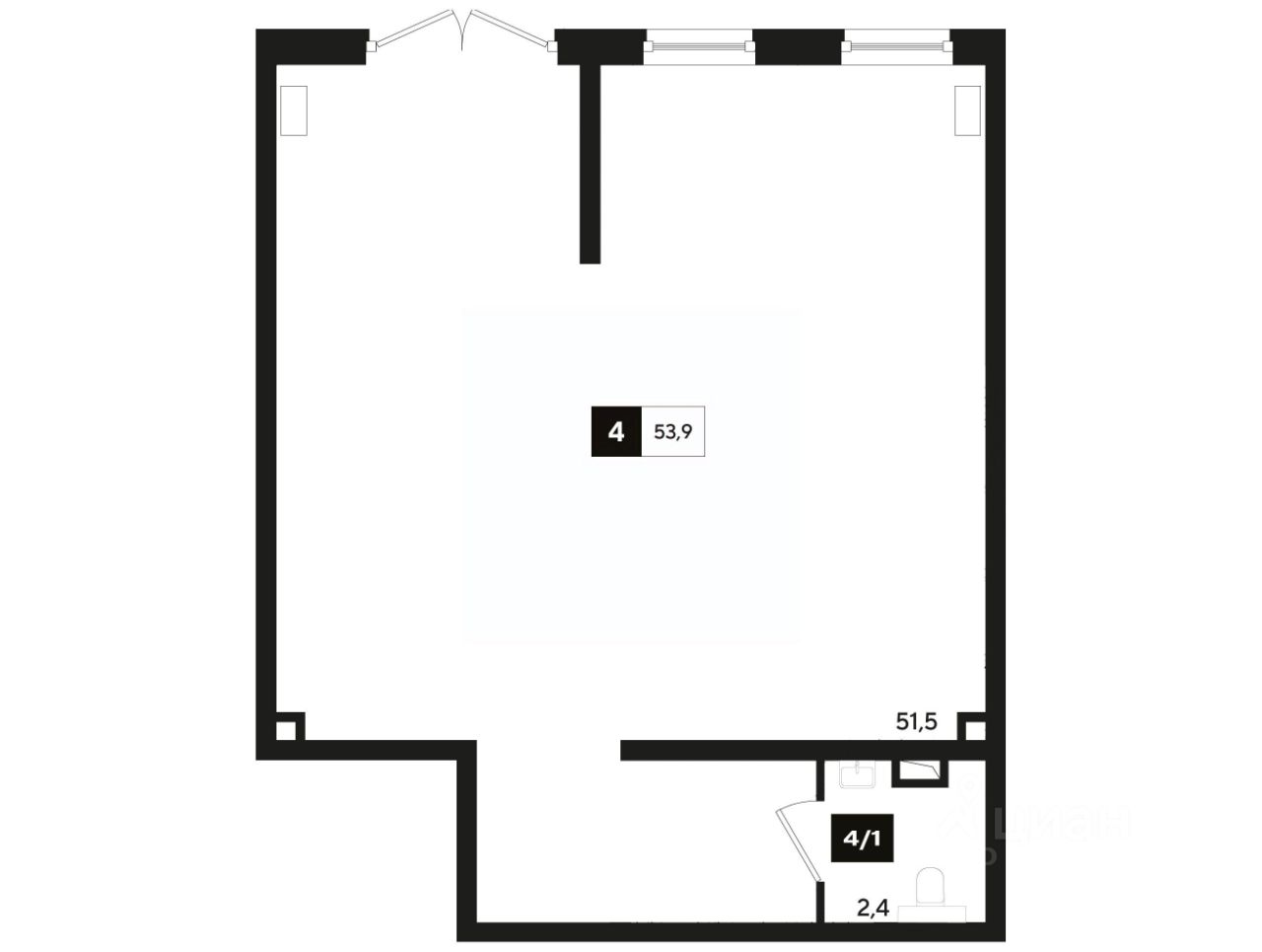 В реализации — коммерческие помещения свободного назначения в литере 4 общей площадью 53.9 кв.м. на 1